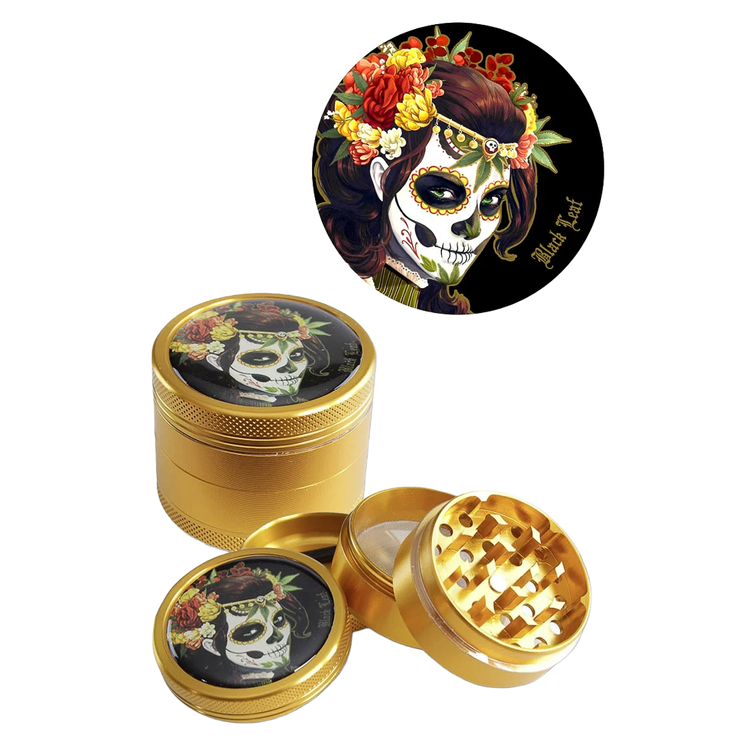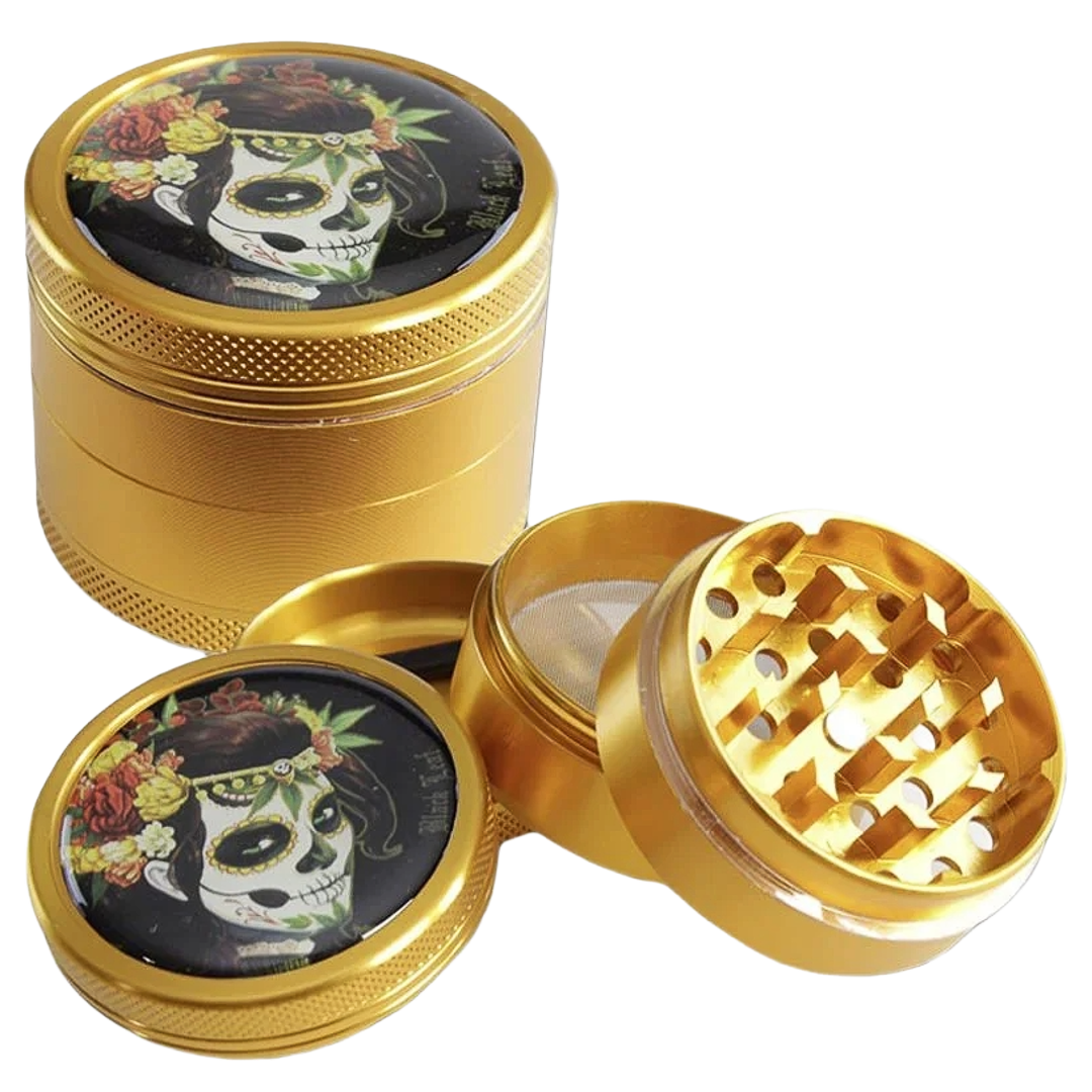 Ceea ce scoate acest dispozitiv instantaneu din anonimatul râșnițelor obișnuite este aspectul său de lux. Carcasa este finisată într-o nuanță metalizată și bogată de auriu, reflectând eleganță și rafinament. Însă, adevărata atracție vizuală se află pe capacul superior, unde este gravat modelul exclusivist „Katrina” – un craniu mexican (Calavera) stilizat. Acest design aduce un omagiu vibrant sărbătorii „Dia de los Muertos”, fiind un simbol al celebrării vieții și un motiv vizual extrem de popular în cultura modernă. Nu este doar un simplu accesoriu utilitar, ci o piesă de colecție (statement piece) care va atrage garantat atenția în orice context.
